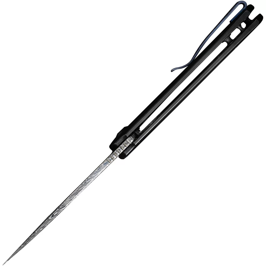 4.5" (11.43cm) closed. 3.5" (8.89cm) Damascus steel blade. Black stonewash finish titanium handle. Extended tang. Lanyard hole. Pocket clip. Black nylon zippered storage case. Boxed.
