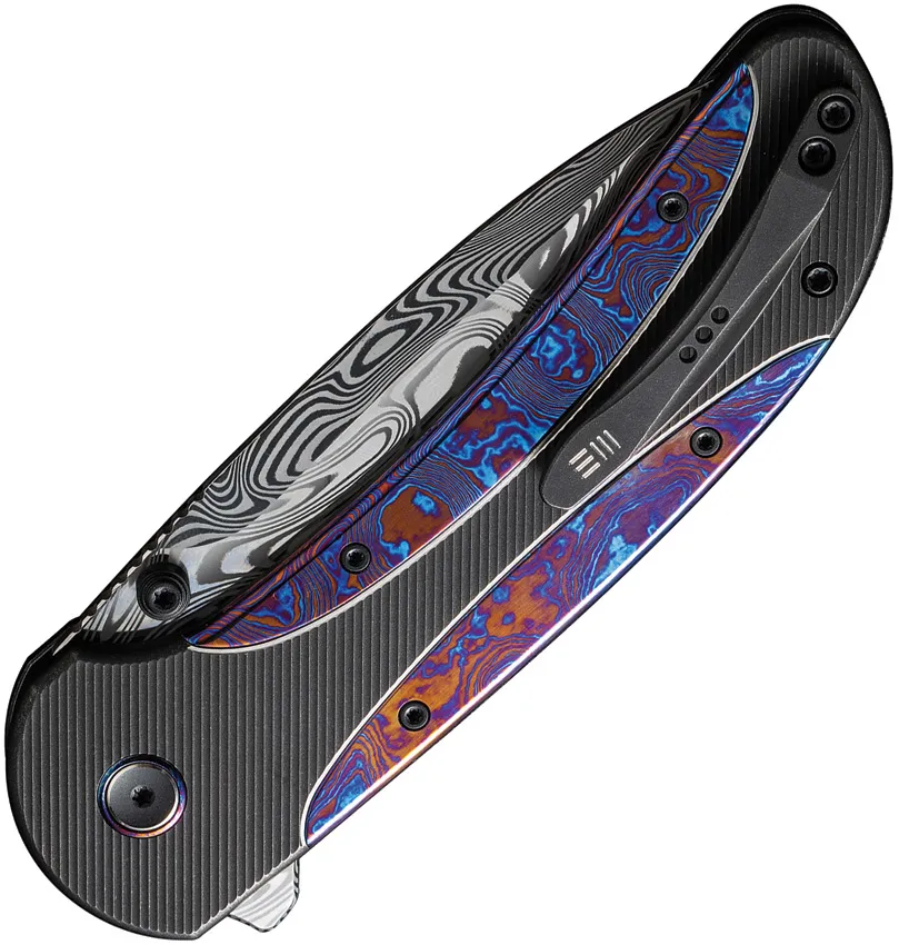 5" (12.7cm) closed. 3.88" (9.86cm) Damascus steel drop point blade. Black titanium handle with Timascus inlay. Extended tang. Thumb stud. Pocket clip. Black nylon zippered storage case. Boxed.