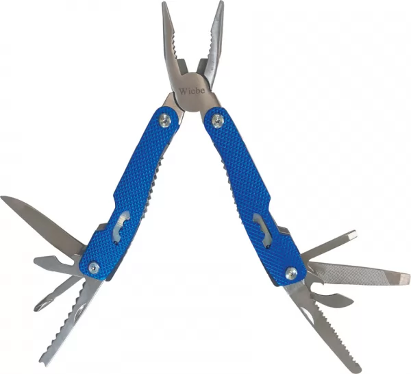 4" closed. Blue aluminum handles. Tools include: Needlenose pliers l Pliers l Wire cutter l Saw blade l Flat head screwdriver l File l Bottle opener l Can opener l Small blade l Ruler. Black nylon belt sheath. Boxed.