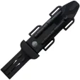 13" (33.02cm) overall. 7.5" (19.05cm) black finish sawback stainless bowie blade. Black ABS handle. Finger ring. Full, extended tang. Sheath features survival whistle, compass, and sharpening rod. Black ABS belt sheath. Boxed.