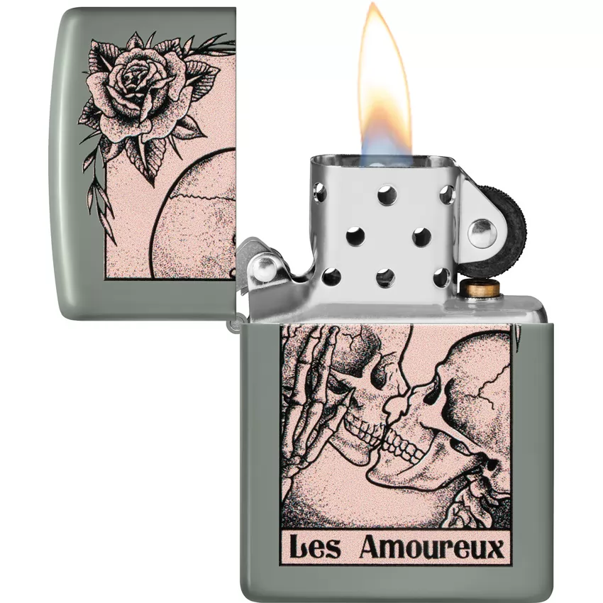 The Zippo Death Kiss Lighter, model BRK-ZO53220, features a bold, skull and crossbones design, a testament to enduring style. This windproof lighter offers reliable ignition in various conditions, crafted with Zippo's signature durability and quality. Its all-metal construction provides a satisfying heft and the refillable design ensures a lifetime of use. A genuine Zippo product, it's backed by the renowned guarantee, promising lasting performance. This collectible item is a statement piece, perfect for those who appreciate iconic design and rugged reliability. Dimensions: 0.5" x 2.25". Green Matte. Boxed.
