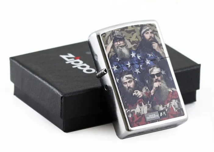 $20.15Zippo 28885 Item Description:The Zippo Lights DUCK DYNASTY P/W/S/J model 28885 brings the spirit of the bayou to your pocket. This genuine Zippo windproof lighter features a detailed, vibrant Duck Dynasty emblem, showcasing the Robertson family's iconic beards and camo. Crafted with Zippo's renowned reliability and durable construction, this lighter delivers a dependable flame in any condition. Perfect for collectors, outdoorsmen, or fans of the hit show, the DUCK DYNASTY P/W/S/J offers a touch of rustic charm and lights your way with Zippo's signature quality. This refillable lighter comes with Zippo's lifetime guarantee.