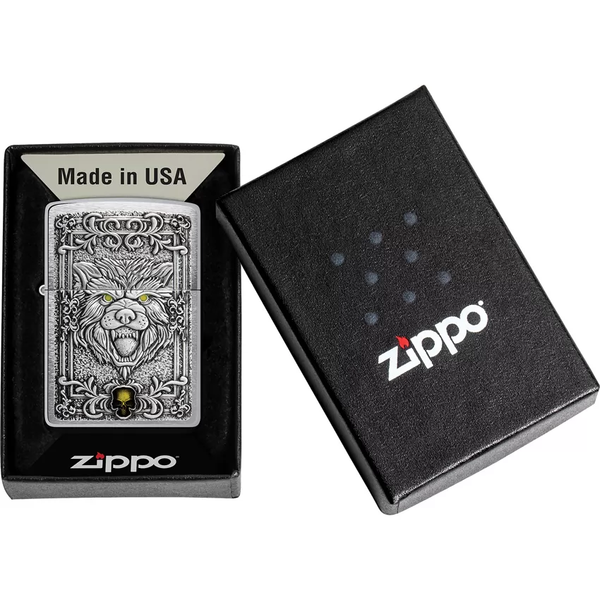 Zippo ZO53775 Item Description:The Zippo Fierce Wolf Lighter (model BRK-ZO53775) showcases the untamed spirit of the wild. This genuine Zippo windproof lighter features a striking wolf design, deeply etched onto a rugged Armor® case. It arrives packaged in an environmentally friendly gift box, ready to ignite with Zippo premium lighter fluid (sold separately). Constructed in the USA and backed by Zippo's famous lifetime guarantee, this lighter delivers reliable, wind-resistant flames whenever you need them. Own a piece of American heritage with this durable and collectible accessory.