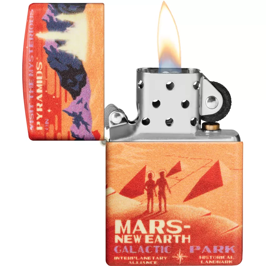 Zippo ZO70762 Item Description:The Zippo BRK-ZO70762 Mars Design Lighter offers a glimpse beyond our world, emblazoned with intricate imagery inspired by the Red Planet. This windproof lighter boasts Zippo's signature reliability and durability, crafted in the USA with a distinctive click that signals its readiness. Built for a lifetime of use, it features a refillable design, ensuring it remains a steadfast companion for years to come. Its sleek profile easily slips into pockets and bags, blending seamlessly into any adventure. With the BRK-ZO70762, you're holding a timeless tool and a piece of cosmic art.